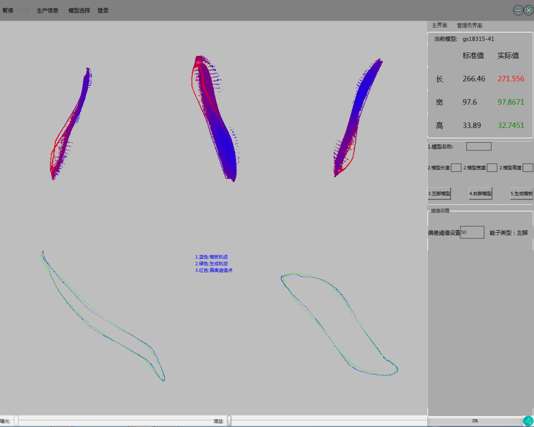 通過以上兩個環(huán)節(jié)的配合工作,流水線上的鞋坯三維信息被準(zhǔn)確捕獲,上位機接收到3D輪廓傳感器采集的鞋坯三維點云數(shù)據(jù),并對數(shù)據(jù)進行三維測量,計算得出被掃描鞋坯的長度、寬度信息,并通過電磁閥彈推裝置對長度在不同尺碼范圍內(nèi)的鞋坯進行分揀。同時上位機界面簡單直觀方便現(xiàn)場工作人員實時查看流水線自動檢測情況,上位機界面如下圖所示: